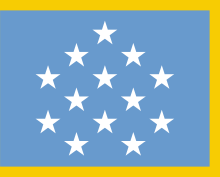 The flag was based on a concept by retired U.S. Army Special Forces First Sergeant Bill Kendall of Jefferson, Iowa,[66] who in 2001, designed a flag to honor Medal of Honor recipient Captain Darrell Lindsey, a B-26 pilot from Jefferson who was killed in action during World War II. Kendall's design of a light blue field emblazoned with 13 white five-pointed stars was nearly identical to that of Sarah LeClerc's of the Institute of Heraldry. LeClerc's gold fringed flag, ultimately accepted as the official flag, does not include the words "Medal of Honor" as written on Kendall's flag. The color of the field and the 13 white stars, arranged in the form of a three bar chevron, consisting of two chevrons of five stars and one chevron of three stars,[1] emulate the suspension ribbon of the Medal of Honor. The flag has no set proportions.[67]