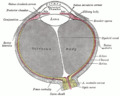 Rectus muscles: 2 = superior, 3 = inferior, 4 = medial, 5 = lateral Oblique muscles: 6 = superior, 8 = inferior Other muscle: 9 = levator palpebrae superioris Other structures: 1 = Annulus of Zinn, 7 = Trochlea, 10 = Superior tarsus, 11 = Sclera, 12 = Optic nerve | |