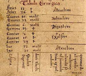 Medical treatments were related to the zodiac in multiple ways. First, one must consider the patient's personality and constitution that were determined by the zodiac sign of one's birthday. Second, the affected part of the body and its sign must be considered. Third, the time of year or season when the patient became sick and its zodiac characteristics had to be assessed. Fourth, decisions about the best day for bleeding, purging, bathing, sweating, or other treatments were made based on the locations and phase of the moon in the zodiac. Finally, herbs and other medicines had to be selected for treatments while considering their associated astrological qualities. Specialized publications advised readers about the best time of year based on the astrological calendar to gather medicinal plants so they would be the most beneficial.[10]