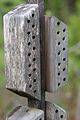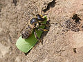 Many Megachile species use cut leaves to line the cells of their nests. It is thought that the leaf discs help prevent the desiccation of the larva's food supply.[1] Various species in the genus, especially those in the subgenus Chalicodoma and related groups, do not use cut leaves to line the cells, but instead use fairly dry plant resin, which they carry in their mandibles. The subgenus Chalicodoma includes the world's largest bee, Megachile pluto, as well as one of the largest megachilids in the United States, the recently introduced Asian species, Megachile sculpturalis.