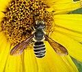 The genus Megachile is a cosmopolitan group of solitary bees, often called leafcutter bees or leafcutting bees; it also includes the called resin bees and mortar bees. While other genera within the family Megachilidae may chew leaves or petals into fragments to build their nests, certain species within Megachile neatly cut pieces of leaves or petals, hence their common name. This is one of the largest genera of bees, with more than 1500 species[1] in over 50 subgenera.[2] The introduced alfalfa leafcutter bee (Megachile rotundata) is managed for crop pollination in various regions around the world.