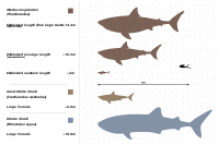 Due to fragmentary remains, there have been many contradictory size estimates for megalodon, as they can only be drawn from fossil teeth and vertebrae.[21]:87[38] Also because of this, the great white shark is the basis of its reconstruction and size estimation,[28]:57 as it is regarded as the best analogue to megalodon.[33] Using length estimates extrapolated from 544 teeth found throughout geological time and geography, including adults and juveniles, a 2015 study estimated an average length of 10.5 meters (34 ft).[10][11] In comparison, the maximum recorded size of the great white shark is 6.1 meters (20 ft), and the whale shark (the largest living fish) can reach 18.8 m (62 ft).[39][40][41][42] It is possible that different populations of megalodon around the globe had different body sizes and behaviors due to different ecological pressures.[11] In any event, it is thought to have been the largest macropredatory shark that ever lived.[43] A 2020 study—looking at the dimensions of the modern great white, mako, and Lamna sharks—suggested a 16 m (52 ft) megalodon would have had a 4.65 m (15.3 ft) long head, 1.41 m (4 ft 8 in) tall gill slits, a 1.62 m (5 ft 4 in) tall dorsal fin, 3.08 m (10 ft 1 in) long pectoral fins, and a 3.85 m (12 ft 8 in) tall tail fin.[8]