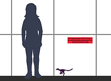 Mei is a troodontid, a group of small, bird-like, gracile maniraptorans. All troodontids have many unique features of the skull, such as closely spaced teeth in the lower jaw, and large numbers of teeth. Troodontids have sickle-claws and raptorial hands, and some of the highest non-avian encephalization quotients, meaning they were behaviourally advanced and had keen senses.[1] The type fossil is a young juvenile about 53 centimetres (21 in) long, complete and exceptionally well preserved in three-dimensional detail, with the snout nestled beneath one of the forelimbs and the legs neatly folded beneath the body, similar to the roosting position of modern birds. This posture provides another behavioral link between birds and dinosaurs.[2] The chemistry of the matrix stone and the resting pose indicate the living animal was probably buried instantly in volcanic ash. A second specimen, DNHM D2154, was also preserved in a sleeping posture.[3]
