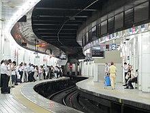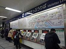This station is built under the Meitetsu Department Store, therefore the station area is very narrow for the large number of passengers, but it is technically difficult to enlarge the station due to the limited and complicated underground area.[1] Therefore, at this station, passengers' waiting spots are separated by destination. Passengers are required to wait at their spot to go.[2]
