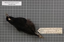 The two melampittas are pitta-like birds that have entirely black plumage and strong long legs and large strong feet.[3] The wings are short and rounded, and the primary feathers are uniquely recurved and emarginated.[8] The feathers of the forecrown are erectile. The lesser melampitta is around 18 cm (7.1 in) long and weighs around 30 g (1.1 oz) , whereas the greater melampitta is larger and considerably heavier at around 29 cm (11 in) in length and weighs 205 g (7.2 oz). The bill of the greater melampitta is also larger than that of the lesser melampitta, which is hooked.[3] There is some variation in the family in the tails. The greater melampitta has specially strengthened remiges and retriges, which are often worn, a possible adaptation to its habit of roosting in limestone sinkholes. Those sinkholes are too deep and narrow to fly directly out and the tail may be used to help cling to the side of the hole as it exits, in the fashion of a woodpecker.[11] The tail of that species is long, whereas the tail of the lesser melampitta is short; in both species end of the tail is rounded.[8] Both species move around on the ground by hopping.[14][15]