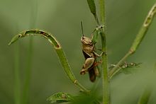 Melanoplus species eat grasses of all kinds, as well as leafy and grassy agricultural crops and garden plants. They feed on the leaves, and sometimes fruit, flowers, and buds, as well as tree bark. Many of the more notable agricultural pest grasshoppers belong here, including the Rocky Mountain locust, the most significant insect pest of the 19th century Great Plains, but now extinct.[1]
