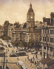 Melbourne was officially incorporated as a town on 13 December 1842, with Henry Condell as its first Mayor. However, it wasn't until 1854 that its first Town Hall was completed. Begun in 1851, the work ground to a halt with the beginning of the Victorian gold rush. The foundation stone of a new, grander Town Hall was laid on 29 November 1867 by the visiting Prince Alfred, Duke of Edinburgh, after the demolition of the first.[1][2] The current Town Hall officially opened on 11 August 1870 with a lavish ball, which was personally funded by the Lord Mayor Samuel Amess.[3][4][5]