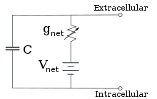 For fixed ion concentrations and fixed values of ion channel conductance, the equivalent circuit can be further reduced, using the Goldman equation as described below, to a circuit containing a capacitance in parallel with a battery and conductance. In electrical terms, this is a type of RC circuit (resistance-capacitance circuit), and its electrical properties are very simple. Starting from any initial state, the current flowing across either the conductance or the capacitance decays with an exponential time course, with a time constant of τ = RC, where C is the capacitance of the membrane patch, and R = 1/gnet is the net resistance. For realistic situations, the time constant usually lies in the 1—100 millisecond range. In most cases, changes in the conductance of ion channels occur on a faster time scale, so an RC circuit is not a good approximation; however, the differential equation used to model a membrane patch is commonly a modified version of the RC circuit equation.