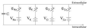 Electrophysiologists model the effects of ionic concentration differences, ion channels, and membrane capacitance in terms of an equivalent circuit, which is intended to represent the electrical properties of a small patch of membrane. The equivalent circuit consists of a capacitor in parallel with four pathways each consisting of a battery in series with a variable conductance. The capacitance is determined by the properties of the lipid bilayer, and is taken to be fixed. Each of the four parallel pathways comes from one of the principal ions, sodium, potassium, chloride, and calcium. The voltage of each ionic pathway is determined by the concentrations of the ion on each side of the membrane; see the Reversal potential section above. The conductance of each ionic pathway at any point in time is determined by the states of all the ion channels that are potentially permeable to that ion, including leakage channels, ligand-gated channels, and voltage-gated ion channels.