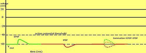 Whether a postsynaptic potential is considered excitatory or inhibitory depends on the reversal potential for the ions of that current, and the threshold for the cell to fire an action potential (around –50mV). A postsynaptic current with a reversal potential above threshold, such as a typical Na+ current, is considered excitatory. A current with a reversal potential below threshold, such as a typical K+ current, is considered inhibitory. A current with a reversal potential above the resting potential, but below threshold, will not by itself elicit action potentials, but will produce subthreshold membrane potential oscillations. Thus, neurotransmitters that act to open Na+ channels produce excitatory postsynaptic potentials, or EPSPs, whereas neurotransmitters that act to open K+ or Cl− channels typically produce inhibitory postsynaptic potentials, or IPSPs. When multiple types of channels are open within the same time period, their postsynaptic potentials summate (are added together).