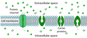 Ion pumps are integral membrane proteins that carry out active transport, i.e., use cellular energy (ATP) to "pump" the ions against their concentration gradient.[9] Such ion pumps take in ions from one side of the membrane (decreasing its concentration there) and release them on the other side (increasing its concentration there).
