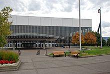 Original plans called for a building made of wood, which is plentiful in the region, but cost and safety factors precluded that. The structure instead consists of a modernistic gray glass and aluminum, non-load-bearing curtain-wall cube around a central ovular concrete seating bowl. Four 70-foot (21 m) concrete piers support the steel roof, with no interior columns required. The exterior appearance, with 80,000 square feet (7,400 m2) of glass, is of a skyscraper laid on its side. The curtain-wall windows inside offer views of the city in all directions. The 1,060-foot-long (320 m) black curtains can be closed to block sunlight in 90 seconds. Seating includes 9,000 permanent seats expandable to 14,000 with portable chairs and bleachers. At its opening, it was called the largest multipurpose facility of its kind in the Pacific Northwest.