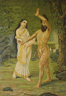 Vishwamitra, one of the most respected and revered sages in ancient India, frightened the gods and even tried to create another heaven - Indra, frightened by his powers, sent Menaka from heaven to earth to lure him and break his meditation. Menaka successfully incited Vishwamitra's lust and passion when he saw her beauty. She succeeded in breaking the meditation of Vishwamitra. However, she fell in genuine love with him and a baby was born to them who later grew in Sage Kanva's ashram and came to be called Shakuntala. Later Shakuntala falls in love with King Dushyanta and gives birth to a child called Bharata after whom India was first named.[3]