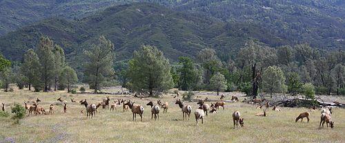 The tule elk is one of the largest land mammals native to California, with cows weighing up to 350 pounds, and the largest bulls weighing roughly 500 pounds. Hunted to near extinction during the state's gold rush era, the animals were reintroduced to the Lake Pillsbury Basin in the late 1970s by the California Department of Fish and Game, and the herd has steadily grown, numbering around 80 in 2007.