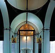 The Rothko Chapel, built in 1971, is an interfaith chapel commissioned by the de Menils. Each year, it hosts more than 60,000 visitors from as many as 85 countries around the world. The entrance-way contains holy books from various religious traditions that may be used in the chapel. The space is sky-lit, with kneeling mats, prayer benches, and meditation cushions. Fourteen canvases by Russian-born American painter Mark Rothko hang in the interior. The Rothko Chapel is an independent, non-profit organization.[11] In 2001 the Chapel was listed in the National Register of Historic Places. It is also a featured entry in National Geographic's book Sacred Places of a Lifetime: 500 of the World's Most Peaceful and Powerful Destinations, published in 2009.[12]