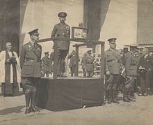 Following the Menin Gate Memorial opening in 1927, the citizens of Ypres wanted to express their gratitude towards those who had given their lives for Belgium's freedom. Hence every evening at 20:00, buglers from the Last Post Association close the road which passes under the memorial and sound the "Last Post".[27] Except for the occupation by the Germans in World War II when the daily ceremony was conducted at Brookwood Military Cemetery, in Surrey, England, this ceremony has been carried on uninterrupted since 2 July 1928.[28] On the evening that Polish forces liberated Ypres in the Second World War, on 6 September 1944 the ceremony was resumed at the Menin Gate despite the fact that heavy fighting was still taking place in other parts of the town.