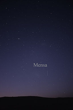 One of the faintest constellations in the night sky, Mensa contains no apparently bright stars—the brightest, Alpha Mensae, is barely visible in suburban skies. Part of the Large Magellanic Cloud, several star clusters and a quasar lie in the area covered by the constellation, and at least three of its star systems have been found to have exoplanets.