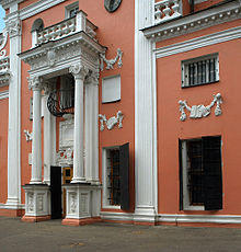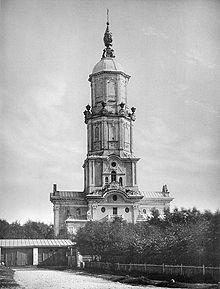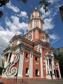 Menshikov Tower (Russian: Меншикова башня), also known as the Church of Archangel Gabriel, is a Baroque Russian Orthodox Church in Basmanny District of Moscow, within the Boulevard Ring. The church was initially built in 1707 to order of Alexander Menshikov by Ivan Zarudny assisted by Domenico Trezzini, a team of Italian-Swiss craftsmen from Ticino and Fribourg cantons and Russian stonemasons from Kostroma and Yaroslavl. The earliest extant Petrine Baroque building in Moscow, Menshikov Tower was substantially altered in the 1770s. The church traditionally functioned in summer only; in winter the congregation assembled in nearby Church of Theodor Stratelates, built in 1782–1806. Church of Saint Theodore also provides the bells for ritual ringing: despite its height, Menshikov Tower does not have bells.