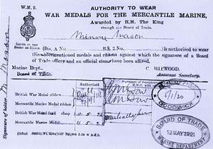 The Mercantile Marine War Medal was established in 1919 and awarded by the Board of Trade of the United Kingdom to mariners of the British Mercantile Marine (later renamed the Merchant Navy)[1] for service at sea during the First World War.[2][3][4]
