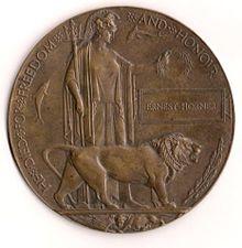 The Memorial Plaque is a medallion designed by Edward Carter Preston, struck in bronze and 4 3&fras1;4 inches (120 millimetres) in diameter, which shows Britannia with two dolphins behind her and a male lion in the foreground. Around the perimeter the medallion is inscribed "HE*DIED*FOR*FREEDOM*" at left and "*AND*HONOVR" at right. The deceased's full name is in relief in a rectangular frame above the lion's head. The exergue depicts the defeat of the Prussian eagle by the British lion. More than a million plaques were produced to commemorate the sacrifice of military and mercantile marine men and women who fell between 4 August 1914 and 30 April 1920.[2][9]