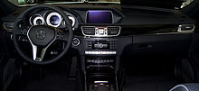 The car's interior cabin was subtly revised, with the new 3-tube instrument cluster, trapezoidal head-unit display, air vents design and a new analogue clock in the center console between the two central vents, like the CLS-Class (W218).[30] A new feature was the two-part trim which stretched across the entire dashboard, available in a wood or aluminium look, irrespective of the equipment line.[33] There was also a redesigned centre console without a selector lever (saloons had already done away with the selector lever as part of the launch of the W212), as well as a new multi-function steering wheel with DIRECT SELECT lever and shift paddles in conjunction with the automatic transmission.[30] If the driver had shifted up or down manually, after a set period of time the transmission would independently switch back to automatic mode to save fuel.[33]