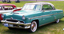 Mercury got a styling and engineering redesign for 1952, such as 18% more window area.[2][5] Monterey became a separate series and Mercury's top model line, a convertible and four-door sedan were included in the new series lineup. The heater and vent controls were changed to levers and placed on a plane set perpendicular to the dash behind the steering wheel, inspired by flight controls in large aircraft.[6] A station wagon bowed for 1953, the same year a Siren Red Monterey Convertible became Ford's forty-millionth car produced.[7] 1954 saw the introduction of the new 161 hp (120 kW) overhead valve Ford Y-block V8, as well as the bubble-top Monterey Sun Valley, which had a Plexiglas front half roof which was similar to that of the Ford Crestline Skyliner.[2] The 1954 Montereys also received other alterations, such as new, lower taillights. The Mercury XM-800 concept car, first displayed at the Chicago Auto Show early in 1954, debuted as the Mercury Monterey XM-800.[8][9][10]