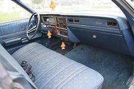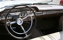 Initially designed for potential production as both an Edsel and a Mercury,[19] the Monterey inherited several design features from the division. The dashboard grouped all instruments and controls centrally around the steering wheel, with thermostat-style climate control (air conditioning was optional), power driver seat (with memory position), and a pre-set speed warning (a precursor to cruise control) offered as options.[23] The "Big M" badging was replaced by lettered Mercury badging across the hood; a scripted "Mercury" badge was added to the interior.
