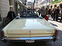 While again derived directly from the Ford Galaxie, the exterior of Mercury sedans adopted multiple design elements from the popular Lincoln Continental, branding the entire Mercury model line designed "in the Lincoln Continental tradition".[41] In place of the vertically-stacked headlights of Ford, the Monterey adopted four horizontal headlamps; the grille was styled similar to the Continental, adopting straight-lined front fenders. The rear fascia was also styled similar to the Continental (adding two taillamp lenses to the bumper); all vestiges of the tailfins were removed. The Monterey was now offered in six body styles, offering two-door and four-door sedans, a four-door sedan with a "Breezeway" rear window, two-door and four-door hardtops, and a two-door convertible.[42][43] The Breezeway roof was now limited to 4-door sedans; as an alternative, hardtops were fitted with passive "flow-through" ventilation.[41]