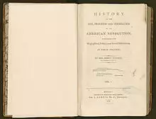 During the debate over the United States Constitution in 1788, she issued a pamphlet, Observations on the new Constitution, and on the Federal and State Conventions written under the pseudonym "A Columbian Patriot", that opposed ratification of the document and advocated the inclusion of a Bill of Rights. Observations was long thought to be the work of other writers, most notably Elbridge Gerry. It was not until her descendant, Charles Warren, found a reference to it in a 1787 letter to British historian, Catharine Macaulay, that Warren was accredited authorship.[2] In 1790, she published a collection of poems and plays under her own name, a highly unusual occurrence for a woman at the time. In 1805, she published one of the earliest histories of the American Revolution, a three-volume History of the Rise, Progress, and Termination of the American Revolution, the first history of the American Revolution authored by a woman.