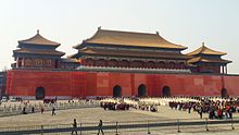 The Meridian Gate or Wumen (simplified Chinese: 午门; traditional Chinese: 午門; pinyin: Wǔmén; Manchu: ᠵᡠᠯᡝᡵᡤᡳ