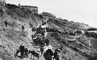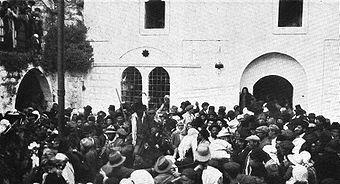 Towards the end of World War I, the ruins of the Meron synagogue were acquired by the "Fund for the Redemption of Historical Sites" (Qeren le-Geulat Meqomot Histori'im), a Jewish society headed by David Yellin.[24] In 1931, Meron consisted of an Arab and Jewish quarter, with the former being the larger one and the latter being built around the tomb of bar Yochai. That year, there were 259 Arabs and 31 Jews. Sami Hadawi's 1945 survey, conducted toward the end of the British Mandate in Palestine, depicted an entirely Arab population. Meron had a boy's elementary school. Agriculture and livestock was the dominant economic sectors of the village, with grain being the primary crop, followed by fruits. Around 200 dunams of land were planted with olive trees, and there were two presses in the village used to process olives.[19]