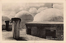 A number of European travellers came to Meron over the course of the 19th century and their observations from the time are documented in travel journals. Edward Robinson, who visited Meron during his travels in Palestine and Syria in the mid-19th century, describes it as "a very old looking village situated on a ledge of bristling rocks near the foot of the mountain. The ascent is by a very steep and ancient road [...] It is small, and inhabited only by Muhammedans."[17] The tombs of Shimon bar Yochai, his son rabbi Eleazar and those of Hillel and Shammai are located by Robinson as lying within a khan-like courtyard underneath low-domed structures that were usually kept closed with the keys held in Safad. Robinson indicates that this place was the focal point of Jewish pilgrimage activities by his time; the synagogue is described as being in ruins.[17]