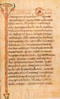 The Luxeuil type uses distinctive long, slim capital letters as a display script. These capitals have wedge-shaped finials, and the crossbar of ⟨a⟩ resembles a small letter ⟨v⟩ while that of ⟨h⟩ is a wavy line. The letter ⟨o⟩ is often written as a diamond shape, with a smaller ⟨o⟩ written inside. The letter ⟨a⟩ resembles two ⟨c⟩s ("cc"), and because of this distinctive feature the Luxeuil type is sometimes called "a type".[1] The letter ⟨b⟩ often has an open bowl and an arm connecting it to the following letter, the letter ⟨d⟩ can have either a vertical ascender or an ascender slanted to the left; ⟨i⟩ is often very tall, resembling l; ⟨n⟩ can be written with an uncial form (similar to a capital ⟨N⟩); ⟨o⟩ is often drop-shaped and has a line connecting it to the next letter; and ⟨t⟩ has a loop extending to the left of its top stroke. The letter ⟨t⟩ is also used in numerous ligatures where it has many other forms. The letters ⟨e⟩ and ⟨r⟩ are also quite often found in ligature.
