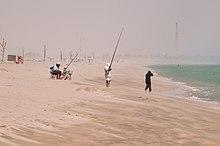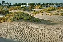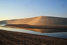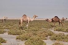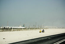 The eastern section is situated over a low, rocky promontory which is enclosed by sabkhas on the coast. The sabkha region is 40 kilometres (25 mi) long and between 7 kilometres (4.3 mi) and 10 kilometres (6.2 mi) wide. The southern portion of Mesaieed is characterized by sand dunes.[9] To the northeast of the coast, where the residential section is located, there are sandy hillocks which lie 9 m above sea level.[20] Roughly 262 hectares of mangroves are found around Mesaieed's coastline.[21]