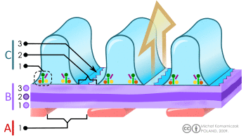 The part of the podocyte in contact with the glomerular basement membrane is called a podocyte foot process or pedicle (Fig. 3): there are gaps between the foot processes through which the filtrate flows into Bowman's space of the capsule.[4] The space between adjacent podocyte foot processes is spanned by slit diaphragms consisting of a mat of proteins, including podocin and nephrin. In addition, foot processes have a negatively charged coat (glycocalyx) that repels negatively charged molecules such as serum albumin.