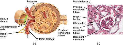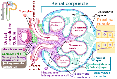 The glomerulus is a tuft of capillaries located within Bowman's capsule within the kidney.[2] Glomerular mesangial cells structurally support the tufts. Blood enters the capillaries of the glomerulus by a single arteriole called an afferent arteriole and leaves by an efferent arteriole.[3] The capillaries consist of a tube lined by endothelial cells with a central lumen. The gaps between these endothelial cells are called fenestrae. The walls have a unique structure: there are pores between the cells that allow water and soluble substances to exit, and after passing through the glomerular basement membrane, and between podocyte foot processes, enter the capsule as ultrafiltrate.