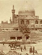 Shias began to make pilgrimages to his grave. By the end of the 9th century, a dome was built above the grave, and many other buildings and bazaars sprang up around it. Over the course of more than a millennium, it has been destroyed and rebuilt several times.[16] In 1161, however, the Ghuzz Turks seized the city, but they spared the sacred area their pillaging. Mashad al-Ridha was not considered a "great" city until Mongol raids in 1220, which caused the destruction of many large cities in Khurasan but leaving Mashhad relatively intact in the hands of Mongolian commanders because of the cemetery of Ali Al-Rezza and Harun al-Rashid (the latter was stolen).[17] Thus the survivors of the massacres migrated to Mashhad.[18] When the traveller Ibn Battuta visited the town in 1333, he reported that it was a large town with abundant fruit trees, streams and mills. A great dome of elegant construction surmounts the noble mausoleum, the walls being decorated with colored tiles.[4] The most well-known dish cooked in Mashhad, "sholeh Mashhadi" (شله مشهدی) or "Sholeh", dates back to the era of the Mongolian invasion when it is thought to be cooked with any food available (the main ingredients are meat, grains and abundant spices) and be a Mongolian word.[19][20]