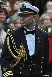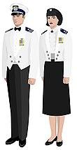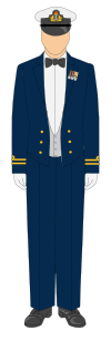 An additional uniform, formal dress (white tie), is optional for all commissioned officers, but may be prescribed for captains and above. This uniform is worn as an equivalent to civilian white tie dress. It is almost identical to the dinner dress blue jacket, except a wing collar shirt, white waistcoat, and white tie are worn. A formal blue tailcoat may also be prescribed.[37]