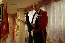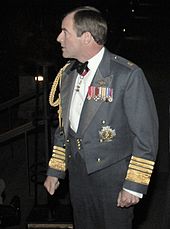 Mess uniforms first appeared in the British Army in about 1845, initially utilizing the short "shell jacket" worn since 1831. This working jacket was worn open over a regimental waistcoat for evening dress.[15] The original purpose was to provide a relatively comfortable and inexpensive alternative to the stiff and elaborate full-dress uniforms then worn by officers for evening social functions such as regimental dinners or balls.[16] With the general disappearance of full dress uniforms after World War I, mess dress became the most colourful and traditional uniform to be retained by most officers in British and Commonwealth armies. Immediately after World War II the cheaper "blue patrols" were worn for several years as mess dress, but by 1956 the traditional uniforms had been readopted.[17]