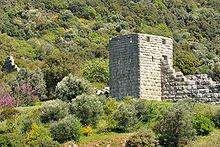 Messene was surrounded by a circuit wall 9 km (5.6 mi) long, 7 metres (23 feet) — 9 metres (30 feet) high.[11] It was fortified by 30 square or horseshoe-shaped guard towers (and probably barracks) with doors admitting passage to a protected walkway on top of the wall. The wall was pierced by two main gates flanked by protective structures and rectangular in shape with a lintel of a single, massive beam of limestone. Through the Arcadia Gate to the north ran and still runs the main road north (to Arcadia), currently from Mavromati. As Mavromati is the location of the major spring capture, klepsydra, it was probably first stop for travellers to the city. From there a road runs over the ridge adjoining Mounts Ithome and Eva to the Laconia Gate, similar to the Arcadia Gate. The wall runs straight up the ridge but does not encompass Mount Eva. Today the next stop on the road is the monastery, Mone Voulkanou, set into the lower southeast flank of Mounts Eva.