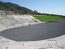 Most of the area of Ancient Messene contains the ruins of the large classical city-state of Messene refounded by Epaminondas in 369 BC, after the battle of Leuctra and the first Theban invasion of the Peloponnese.[4] Epaminondas invited the return to their native land of all the families that had gone into exile from Messenia during its long struggle with and servitude under the military state of Sparta, now finished as a conquering state. This new Messene, today's Ancient Messene, was constructed over the ruins of Ithome, an ancient city originally of Achaean Greeks, destroyed previously by the Spartans and abandoned for some time.