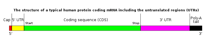 Untranslated regions (UTRs) are sections of the mRNA before the start codon and after the stop codon that are not translated, termed the five prime untranslated region (5' UTR) and three prime untranslated region (3' UTR), respectively. These regions are transcribed with the coding region and thus are exonic as they are present in the mature mRNA. Several roles in gene expression have been attributed to the untranslated regions, including mRNA stability, mRNA localization, and translational efficiency. The ability of a UTR to perform these functions depends on the sequence of the UTR and can differ between mRNAs. Genetic variants in 3' UTR have also been implicated in disease susceptibility because of the change in RNA structure and protein translation.[17]