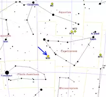 Messier 30 (also known as M30 or NGC 7099) is a globular cluster of stars in the southeast of the southern constellation of Capricornus, at about the declination of the sun when the latter is at December solstice.[a] It was discovered by the French astronomer Charles Messier in 1764, who described it as a circular nebula without a star. In the New General Catalogue, compiled during the 1880s, it was described as a "remarkable globular, bright, large, slightly oval." It can be easily viewed with a pair of 10×50 binoculars,[9] forming a patch of hazy light some 4 arcminutes wide that is slightly elongated along the east–west axis.[9] With a larger instrument, individual stars can be resolved and the cluster will cover an angle of up to 12 arcminutes across graduating into a compressed core about one arcminute wide that has further star density within.[10]