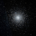 M75 is about 67,500[3] light years away from Earth and is 14,700[6] light years away from, and on the opposite side of, the Galactic Center.[8] Its apparent size on the sky translates to a true radius of 67 light years.[5] M75 is classified as class I, meaning it is one of the more densely concentrated globular clusters known. It shows a slow rotation around an axis that is inclined along a position angle of −15°±30°.[3] The absolute magnitude of M75 is about −8.5, equating to 180,000 times more luminous than the Sun (L☉).[7]