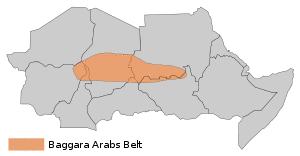 The Messiria, known also under the name of Misseriya Arabs, are a branch of the Baggara ethnic grouping of Arab tribes.[1] Their language is the Sudanese Arabic. Numbering over one million, the Baggara are the second largest ethnic group in Western Sudan, extending into Eastern Chad. They are primarily nomadic cattle herders and their journeys are dependent upon the seasons of the year. The use of the term Baggara carries negative connotations as slave raiders, so they prefer to be called instead Messiria.