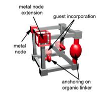 Post-synthetic modification techniques can be used to exchange an existing organic linking group in a prefabricated MOF with a new linker by ligand exchange or partial ligand exchange.[30][31] This exchange allows for the pores and, in some cases the overall framework of MOFs, to be tailored for specific purposes. Some of these uses include fine-tuning the material for selective adsorption, gas storage, and catalysis.[30][10] To perform ligand exchange prefabricated MOF crystals are washed with solvent and then soaked in a solution of the new linker. The exchange often requires heat and occurs on the time scale of a few days.[31] Post-synthetic ligand exchange also enables the incorporation of functional groups into MOFs that otherwise would not survive MOF synthesis, due to temperature, pH, or other reaction conditions, or hinder the synthesis itself by competition with donor groups on the loaning ligand.[30]
