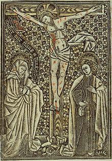 The second technique, was introduced in the second half of the 15th century and worked from black to white, meaning that the print showed white lines on a black background, rather than the other way round as in the first technique. Again prints were nearly always on religious subjects. Usually the main lines of the figures and landscape were done in engraving. Then using metalwork punches, the rest of the image is composed of repeated use of the same pattern of punch in a particular area. These might be dots, circles, lozenges, stars, letters making text inscriptions, or more complicated shapes for the borders. Usually very little space is left undecorated; and this technique is easy to recognise.[3] These prints ceased to be produced about 1500.[1] The plates themselves may have been treated as works of art in plaque form, with printed impressions a useful by-product; in some cases inscriptions print in reverse, though others do not.[2] Some copper plates survive, often with nail-holes at the corners.