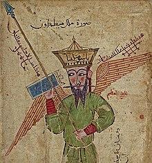 The earliest account of Metatron within Islamic scriptures might derive directly from the Quran itself. Uzair, according to Surah 9:30-31 venerated as a Son of God by Jews, is another name for the prophet Ezra, who was also identified with Metatron in Merkabah Mysticism.[47] Islamic heresiologists repeatedly accused Jews for venerating an angel as a lesser god (or an Incarnation of God), especially for celebrating Rosh Hashanah.[48] The name itself is attested early in Islam by Al-Kindi and Al-Masudi.[49] In a Druze text about cosmology, he is mentioned among the canonical Archangels in Islamic traditions.[49] Al-Suyuti identifies him as the angel of the veil and only he knows about that which lies beyond.[50][3][51] He is also frequently mentioned in the magical works by Ahmad al-Buni, who describes Metatron as wearing a crown and a lance, probably constituting the Staff of Moses.[52] In other magical practises, he is invoked to ward off evil jinn, demons, sorcerers and other magical threats.[53]