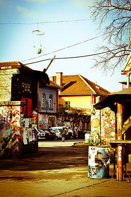 Squatters represent the heart of the matter of legality and formality in Metelkova: the autonomous part is considered to be in a legal and administrative limbo defined through tolerance and legitimization toward city's authority.[2] A possible explanation for this situation is to be found in the nature of the squatting in Metelkova: in fact the old buildings of the Yugoslav army are not occupied for the sole purpose of living there, but also for the aim of producing culture.[9] From this perspective, it is possible to determine the beginning of the tolerance: since 1997, when Ljubljana was designated as the European Capital of Culture, Metelkova stopped hosting permanent residents, following an agreement reached with the municipality, whereby the city decided to dedicate the Metelkova buildings to the promotion of culture and art.[7]