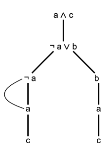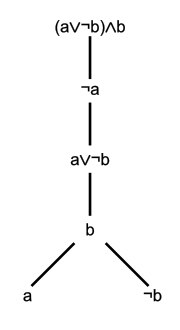 The method works on a tree whose nodes are labeled with formulae. At each step, this tree is modified; in the propositional case, the only allowed changes are additions of a node as descendant of a leaf. The procedure starts by generating the tree made of a chain of all formulae in the set to prove unsatisfiability. A variant to this starting step is to begin with a single-node tree whose root is labeled by ; in this second case, the procedure can always copy a formula in the set below a leaf. As a running example, the tableau for the set is shown.
